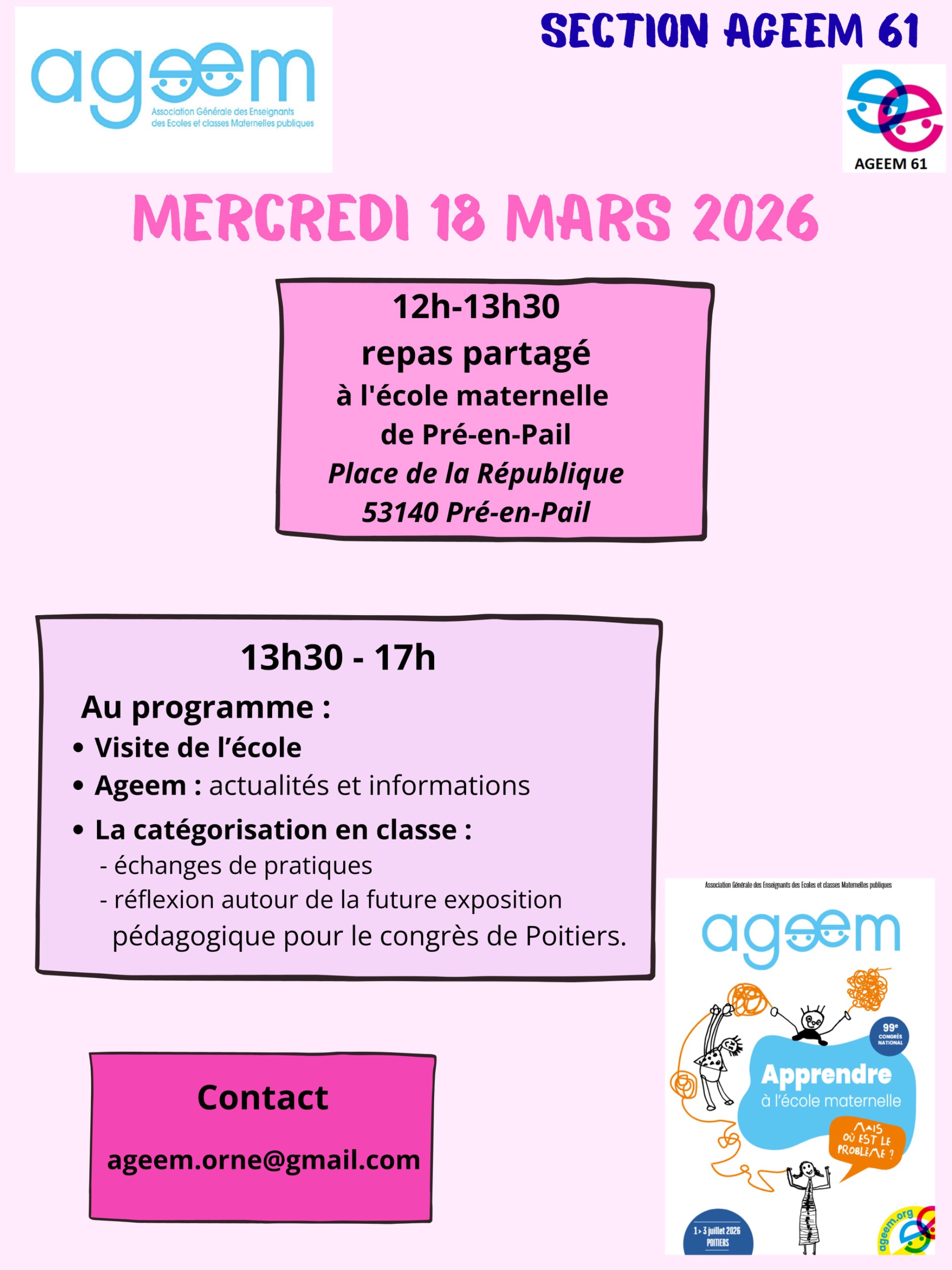 La prochaine réunion se déroulera le mercredi 18 mars 2026 de 14h à 17h à l’école maternelle de Pré en Pail (53) dans la classe d’Hélène.
