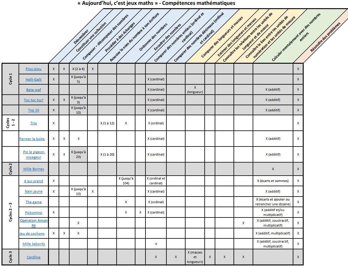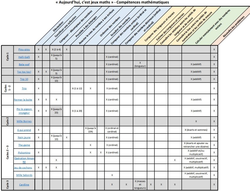 Tableau des compétences mathématiques dans les jeux Ce tableau relève les compétences mathématiques travaillées dans la sélection de jeux « Aujourd’hui, c’est jeux maths ». Tableau des compétences mathématiques dans les jeux